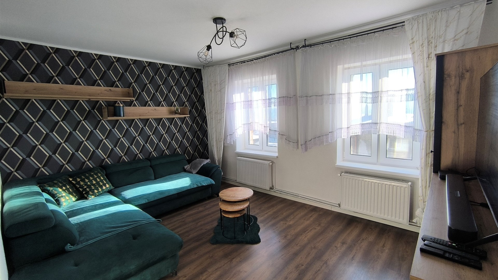 Salon: narożnik z funkcją spania, komoda RTV wraz ze sprzętem, witryna oraz stolik kawowy