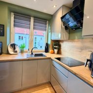 Kuchnia jest wyposażona w meble na wymiar, a także w sprzęt AGD (płyta indukcyjna, okap, piekarnik, zmywarka oraz lodówka. .