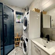 Łazienka z WC wyposażona w prysznic, umywalkę oraz pralkę i suszarkę.