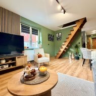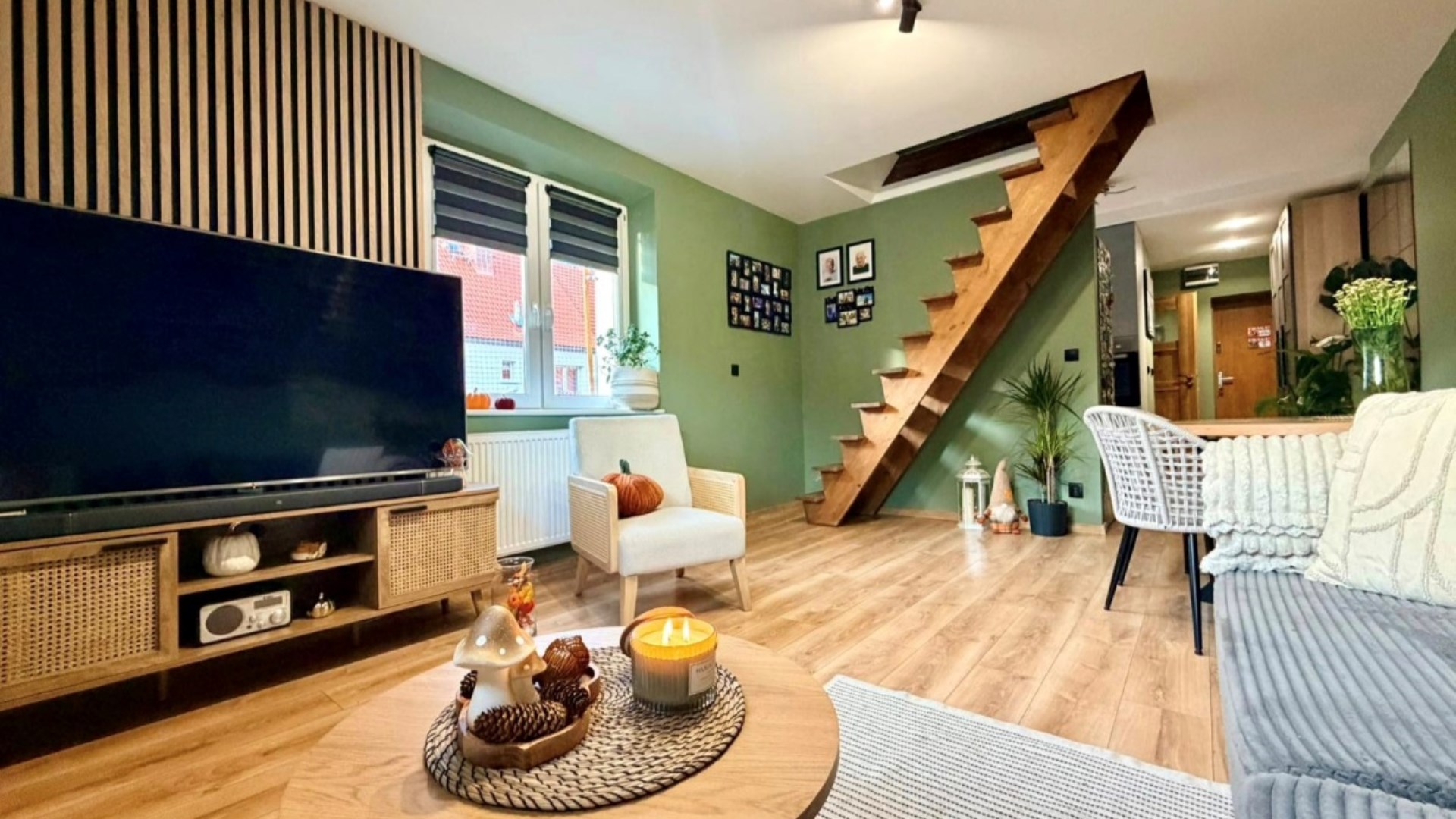 Salon jest przestronny i znajduje się w nim pełne wyposażenie wraz ze stołem. Jest to świetne miejsce na spotkania rodzinne oraz z przyjaciółmi.
